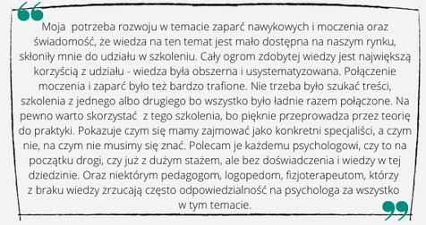 Dzięki odbyciu szeregu szkoleń zarówno z zakresu terapii poznawczo-behawioralnej, jak i NVC na rozwój dziecka patrzy wieloaspektowo. Udziela wsparcia w ramach własnej praktyki psychologicznej, superwizuje przedszkola i szkoły oraz prowadzi warsztaty dla rodziców